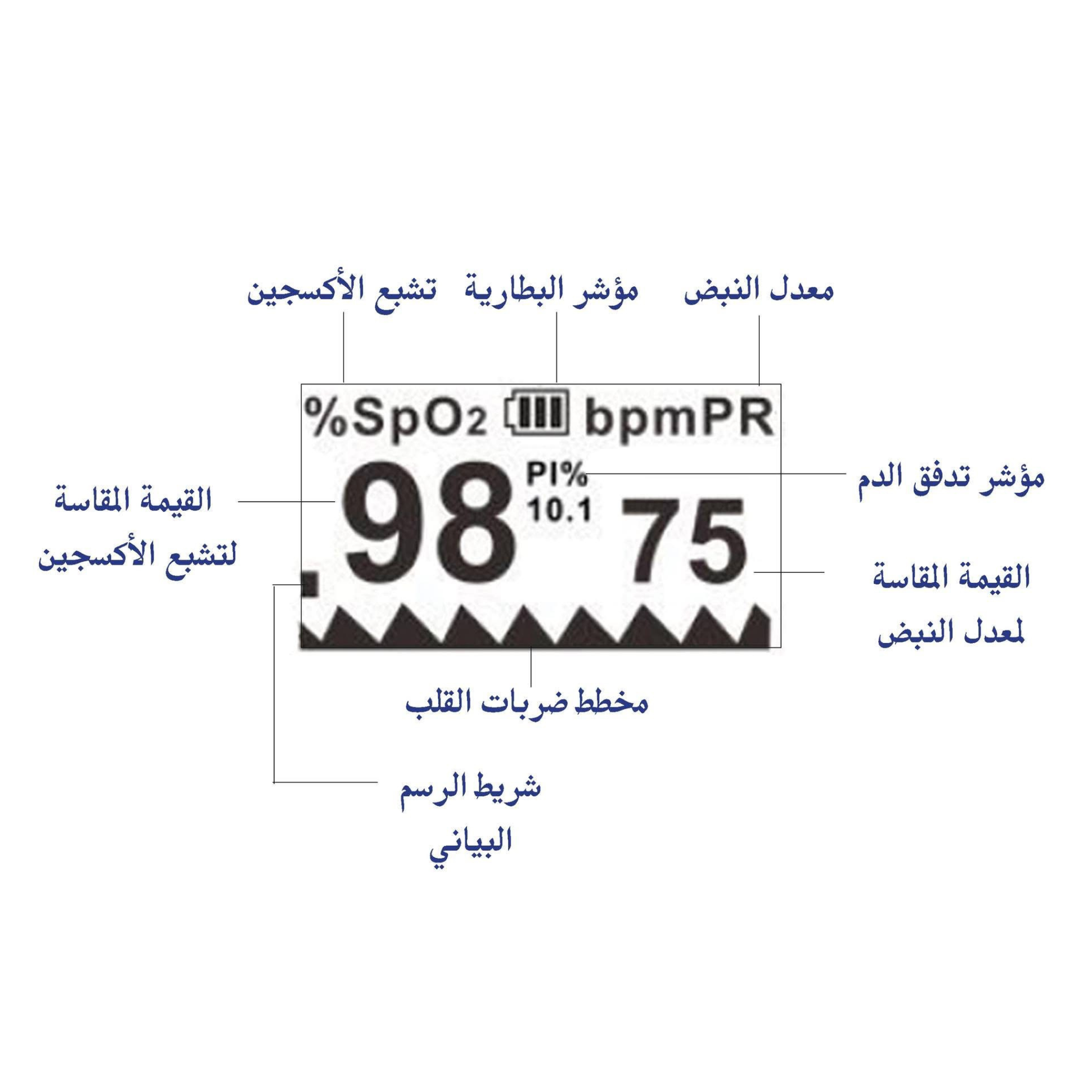 - PI (Perfusion Index) display and graph waveform indicator for real-time monitoring.